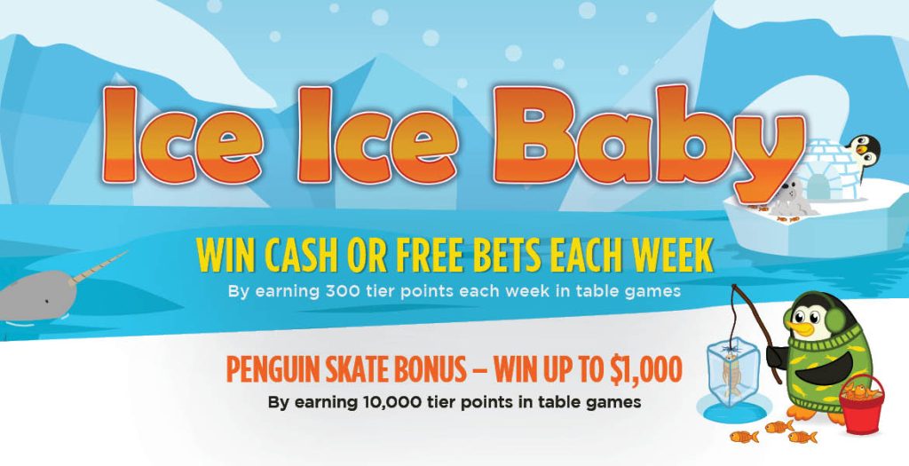 Earn 10,000 tier points in table games from January 1st – 31st, and you can participate in the Penguin Skate Bonus on the kiosk for a chance to win $1,000!